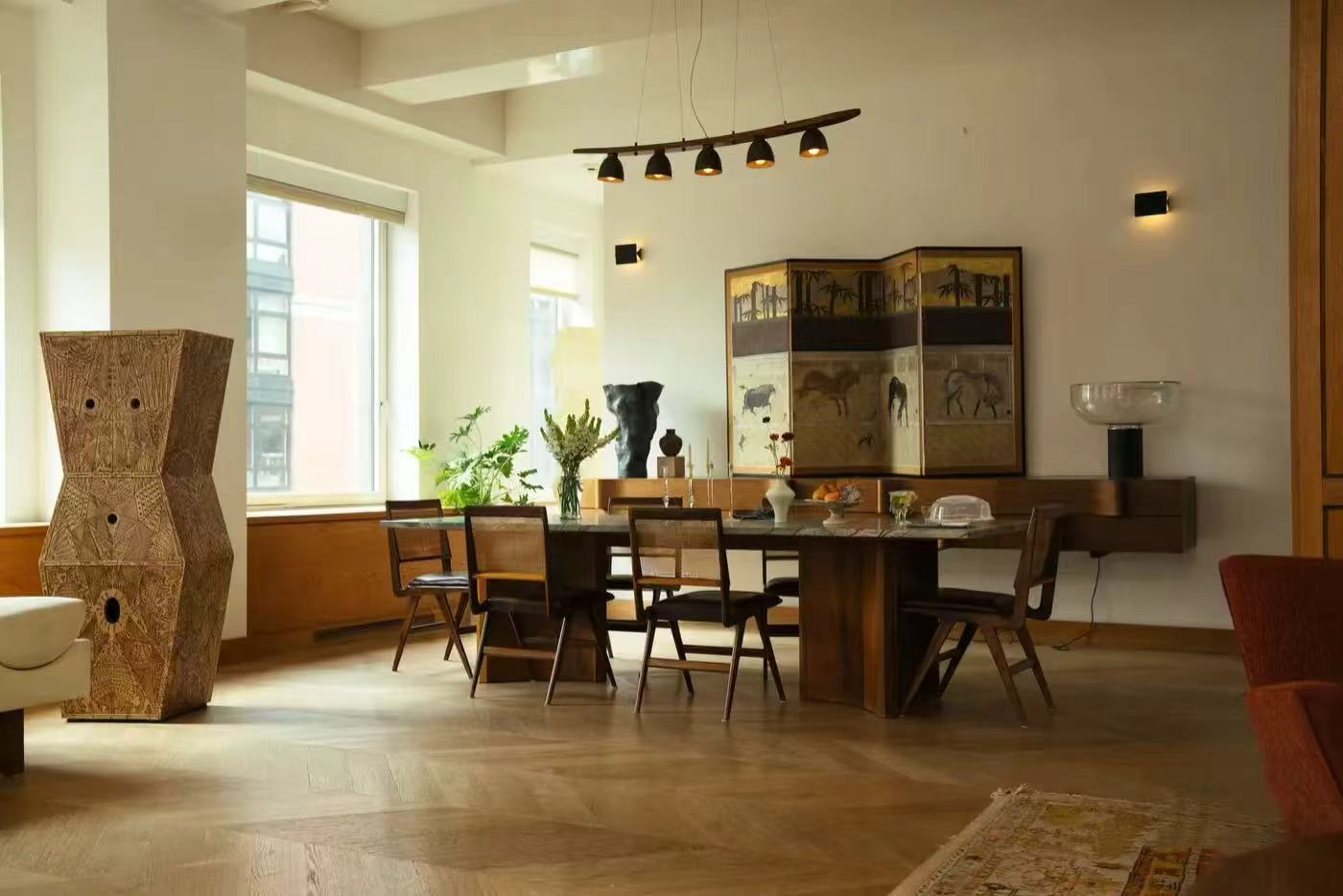 走進這個家,仿佛步入一場靜謐的“老錢”美學盛宴。腳下是溫潤典雅的Herringbone人字拼木地板,胡桃木臺面與通頂的定制木作環抱四周,每一處細節的收邊與質感,都在無聲地訴說著精致。而布景師的精心點綴,更讓空間格調升華。這里擺放的,是Philippe Starck、Charlotte Perriand等設計大師的經典燈具;墻上懸掛的,是Francesco Clemente、Saul Leiter等藝術家的原作。它們不是冰冷的道具,而是與空間、與人物對話的靈魂。