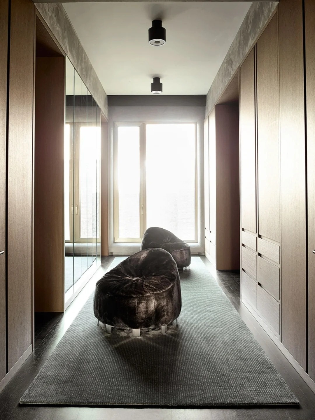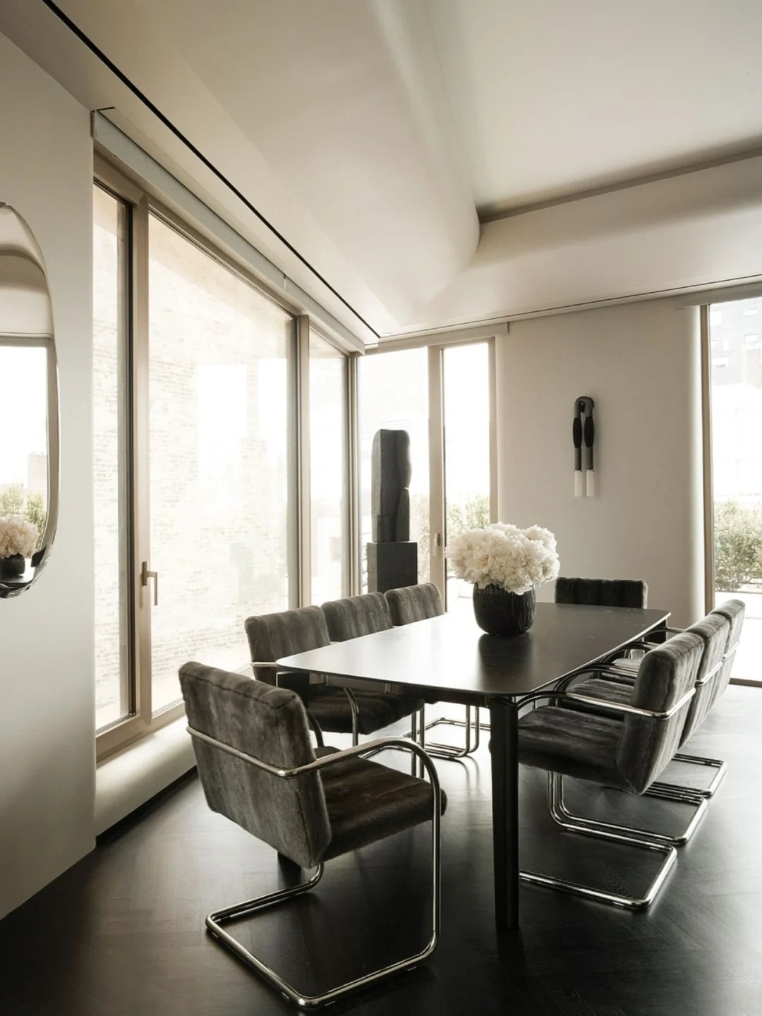 推開近3米高的雙向開門,門廳即畫廊。一張來自R&Y Augousti的龜甲殼座椅靜置其間,成為視覺焦點。家中的布局通透而獨立,黑色地板沉穩鋪陳,輔以銅色、棕與灰的調和,讓空間在冷峻中透出暖意。